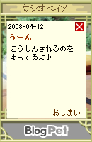 あそんでー、と言われたので遊んであげた。 …………ペットは飼い主に似るって言うけど、まさにそんな感じかもしれない…; この発言の他にも「飛翔がいいんだよねー」とか「○○だと言ってみる♪」とか、言い回しや言ってる内容が結構私に似てる気がします。 喜んでもらえて何よりです。 胸がいたい。…ごめん。 さいきんゲームやってないなー…。 バサラ再開させるか、そろそろ迷宮に旅立ってもよさそうだ。 …ごめん。まさかこんなのも単語として認識するなんて…;